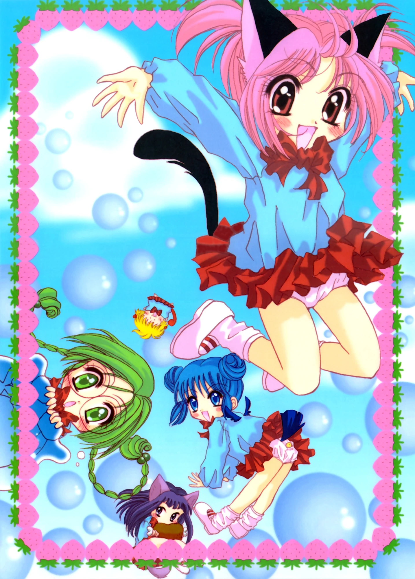 Petite Mew Mew is a short manga series by Mia Ikumi. It is set in a different world from the normal series, a world with fairies and monsters. It is about Ichigo Momomiya and her friends, the other Mew Mews, including the four other original members, and the newer members, Ringo Akai and Berry Shirayuki. They are all in Mew Mew Kindergarden, hence the name petite (which is the feminine way to say "small" in French). Ichigo has cat ears and a tail, Minto Aizawa has bird wings and a tail, and Retasu Midorikawa has a fish tail (based on her reaction to Mew Aqua, making her a mermaid-based mew). Bu-Ling Huang has monkey ears and a tail, Zakuro Fujiwara has wolf ears and a tail, Berry Shirayuki has rabbit ears and a cat tail, and Ringo Akai looks the same.