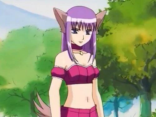 Zakuro's Mew uniform consists of a short, red-violet crop-top with light pink lace lining, red-violet flared shorts and matching thigh-high boots. She sports more red-violet on her armbands, choker and garter belt, located on her left thigh. As well as a pair of matching wristbands. She obtains large grey-brown lupine ears and a tail. Her Mew Pendant is attached to her choker.